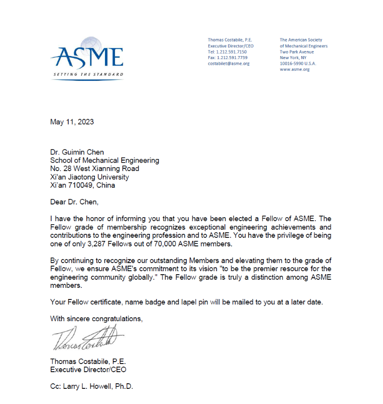 美国机械工程师协会(American Society of Mechanical Engineers,简称ASME)成立于1880年,在全球拥有近十万名会员,是国际性非赢利教育和学术组织。ASME的主要业务包括学术期刊、标准制定、会议出版、教育培训等,其旗下的Transactions of the ASME系列期刊几乎涵盖了机械工程的各个领域并在业界获得高度认可,所制定的压力容器标准等在多个国家得到推广和借鉴,所主办的多个学术会议被视作是机械工程领域的顶级盛会,如IDETC/CIE(国际设计工程技术会议暨计算机与信息工程会议)、IMECE(国际机械工程交流博览会)等,因此ASME被认为是业内最高水平的学术组织之一。ASME Fellow旨在嘉奖国际上在机械工程领域做出重大成就和突出贡献者,作为会员的最高级别,其评选过程极为严谨,每年的获选人数不超过会员总数的千分之一,全球目前ASME Fellow人数仅为三千余人。