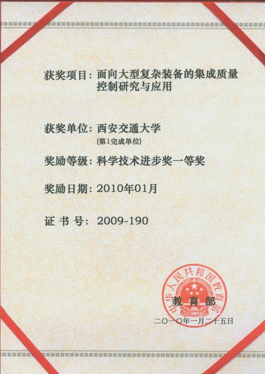 在产品全生命周期的质量保证理论与技术方面,提出了以过程控制为核心、以PDCA循环为特征的集成制造质量系统体系结构及方法,研究开发了面向大型装备制造的集成质量系统。研究成果在航空企业和大型装备制造业(如:西安飞机公司、成都飞机公司、成都亚光电子,汉中燎原航空机械厂、东方汽轮机厂等企业)得到了应用。取得了比较好的经济效益和社会效益,该项成果获2009年度教育部科技进步一等奖。